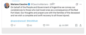 भारत में अर्जेंटीना के राजदूत मारियानो काउसिनो ने भी इस घटना पर शोक व्यक्त करते हुए हताहतों के परिवारों के प्रति संवेदना जाहिर की है।