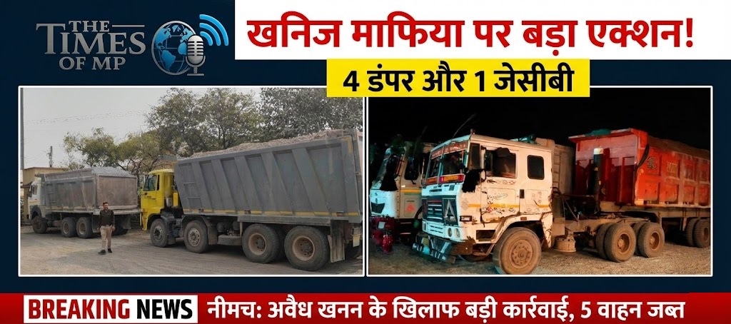 नीमच | मध्य प्रदेश के नीमच जिले में अवैध उत्खनन (Illegal Mining) यानी अवैध उत्खनन करने वाले सिंडिकेट के खिलाफ जिला प्रशासन और खनिज विभाग ने एक निर्णायक और बड़ी कार्रवाई को अंजाम दिया है। जिले के जावद और सिंगोली क्षेत्रों में लंबे समय से मिल रही शिकायतों के बाद, खनिज विभाग की विशेष टीम ने छापामार कार्रवाई करते हुए 4 डंपर और 1 जेसीबी (JCB) मशीन को रंगे हाथों पकड़ा है। इस बड़ी कार्रवाई से पूरे क्षेत्र के खनिज माफियाओं में हड़कंप मच गया है।