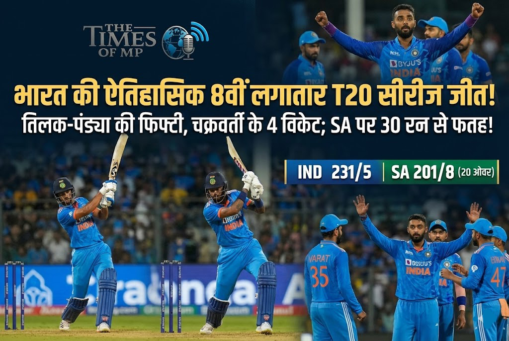 अहमदाबाद: भारतीय क्रिकेट टीम ने टी-20 फॉर्मेट में अपनी बादशाहत कायम रखते हुए एक और ऐतिहासिक उपलब्धि अपने नाम कर ली है। IND vs SA T20 Series के पांचवें और निर्णायक मुकाबले में भारत ने साउथ अफ्रीका को 30 रनों से हराकर सीरीज 3-1 से अपने नाम कर ली। यह जीत इसलिए भी खास है क्योंकि इसके साथ ही टीम इंडिया ने टी-20 फॉर्मेट में लगातार 8वीं सीरीज जीतने का रिकॉर्ड बनाया है। शुक्रवार को अहमदाबाद में खेले गए इस हाई-वोल्टेज मुकाबले में भारतीय बल्लेबाजों के तूफान और फिर गेंदबाजों के कहर के आगे अफ्रीकी टीम घुटने टेकने पर मजबूर हो गई।