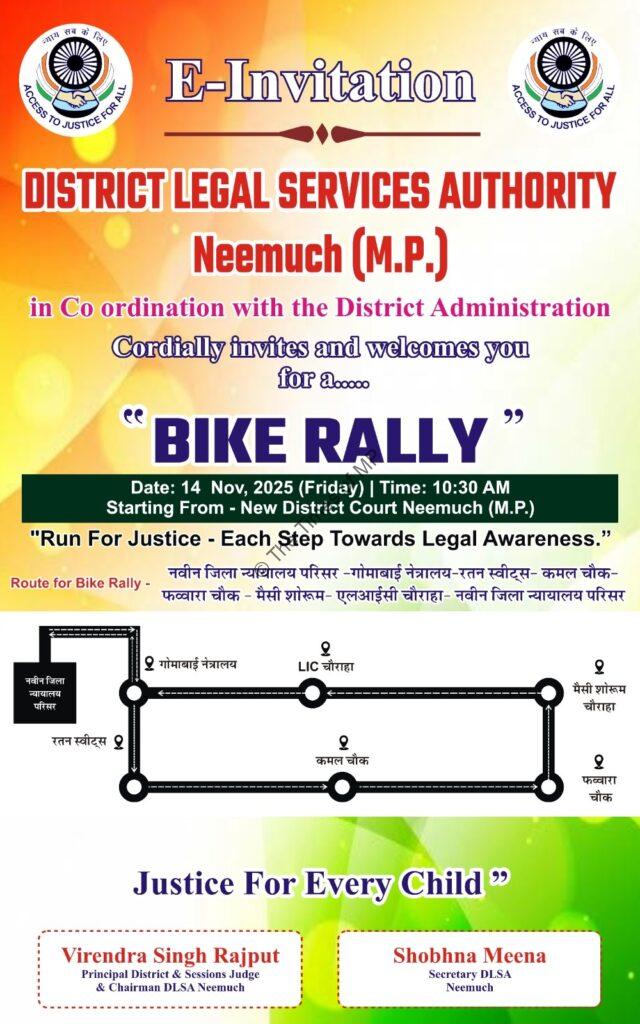 यह विधिक जागरूकता बाइक रैली कल सुबह 10:30 बजे नवीन जिला न्यायालय परिसर, नीमच (म.प्र.) से प्रारंभ होगी।