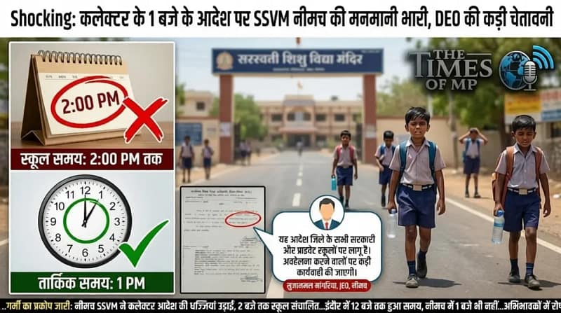 नीमच (The Times of MP)। जिले में भीषण गर्मी और लू का प्रकोप जारी है। बढ़ते तापमान और विद्यार्थियों के स्वास्थ्य को ध्यान में रखते हुए, नीमच जिला शिक्षा अधिकारी ने कलेक्टर के अनुमोदन से स्कूलों के समय में बदलाव का कड़ा आदेश जारी किया था। आदेश के मुताबिक, अब जिले के सभी शासकीय और अशासकीय स्कूलों की छुट्टी दोपहर 1:00 बजे तक अनिवार्य रूप से होनी चाहिए। प्रशासन इसे बच्चों की सुरक्षा और स्वास्थ्य के लिए उठाया गया अहम कदम बता रहा है।